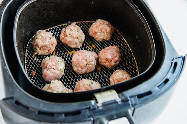 Roll meatballs into a golf ball size shape. If freezing or storing in the refrigerator for later use, place balls in a single layer inside a ziploc bag. If cooking right away, place inside the air fryer basket about 1/2 inch apart.