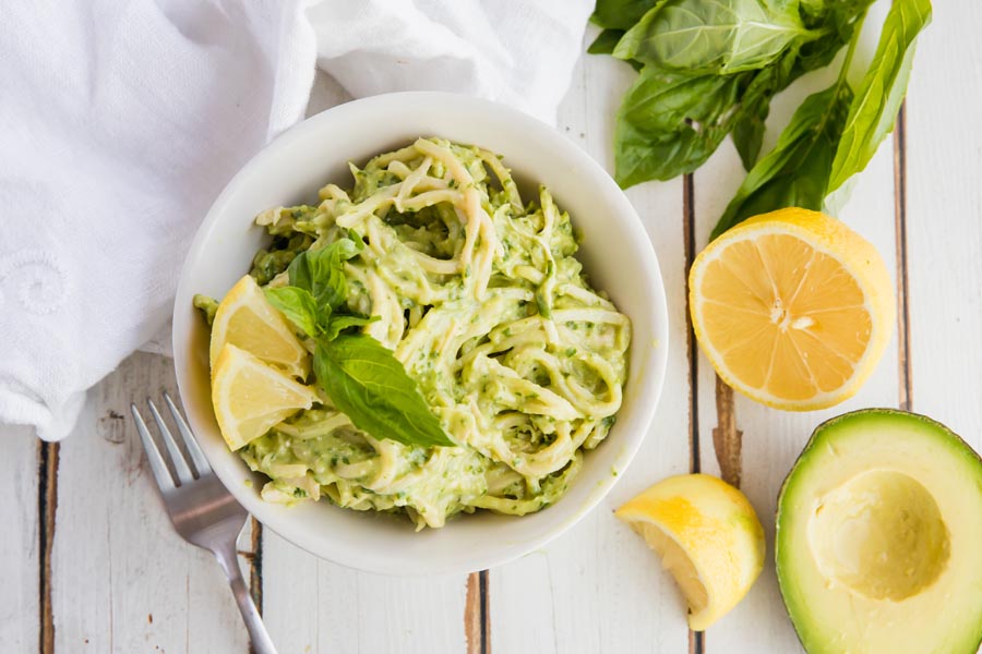 Creamy avocado pesto sauce drizzles over a bed of low-carb noodles. This keto basil pesto pasta dish is an easy lunch you can make in a snap with avocados.