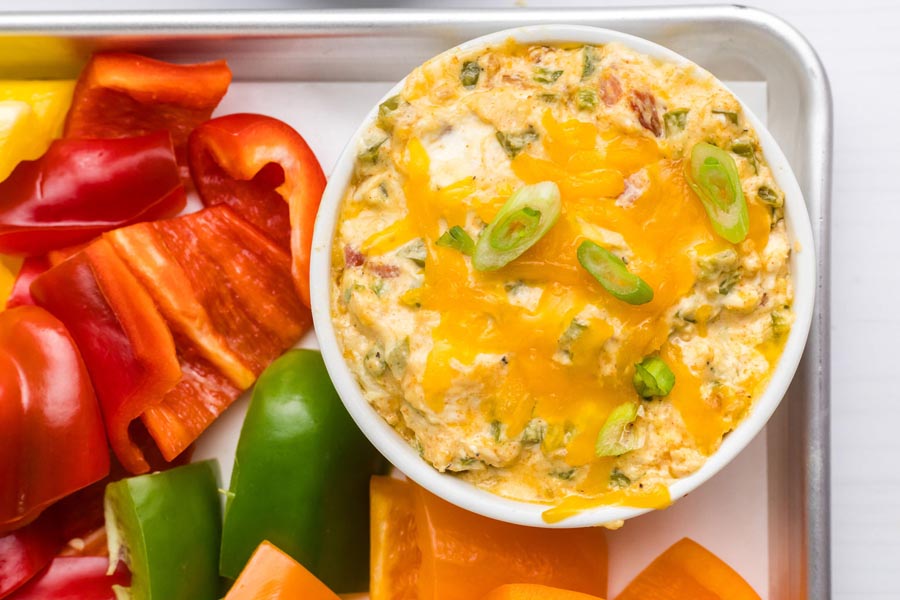 After baking, top with the remaining chopped, cooked bacon and serve with halved peppers, celery, jicama sticks, or low-carb tortilla chips.