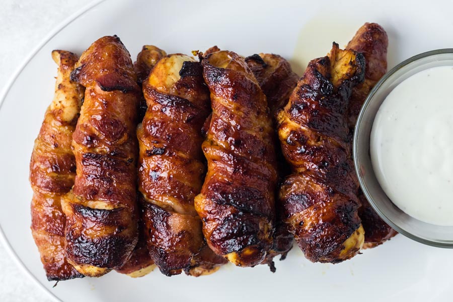 To get the juiciest chicken and crispiest bacon, cook the BBQ chicken tenders in the air fryer. If you don’t have an air fryer, no worries – an oven will work just fine and those instructions are included in the recipe card.