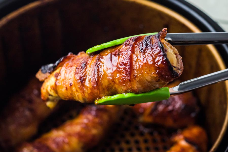 Cook in the air fryer at 400 °F for 10-15 minutes or until chicken reaches an internal temperature of 165 °F and bacon is crispy.