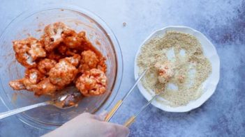 Add lupin meal to a small plate or bowl. Roll each cauliflower floret in lupin meal to coat. Place on baking tray or air fryer basket.