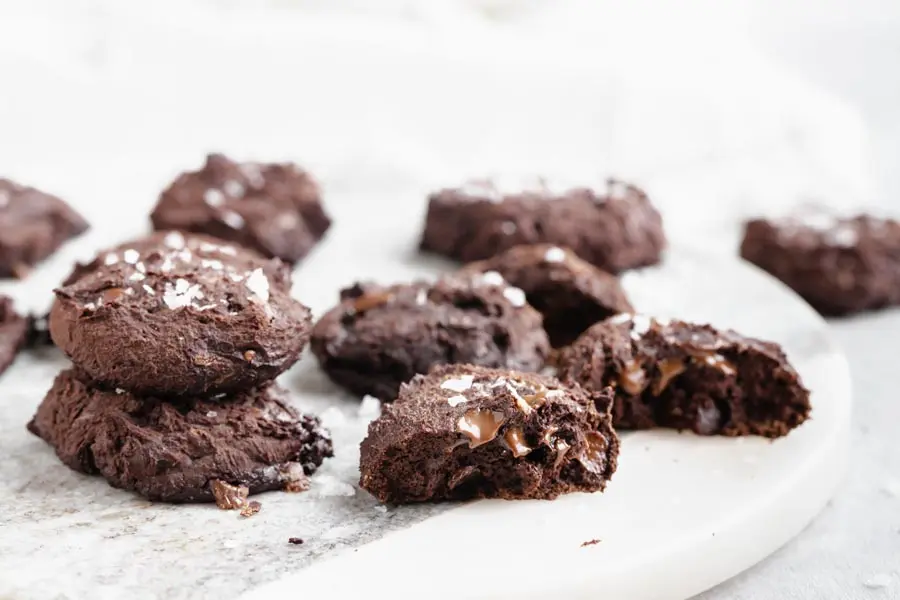 You don’t need flour to make cookies! You don’t even need an oat, nut or seed flour substitution either – like rolled oats, almond flour or coconut flour. Most flourless cookie recipes use peanut butter or a nut butter like almond flour. These no flour cookies use a combination of egg, cocoa powder and sweetener to form the bulk of the cookie which results in a cookie texture and rich chocolate flavor. Peanut butter is not necessary to make a delicious cookie without flour. Chocolate chips give rich, melty chocolate in every bite.