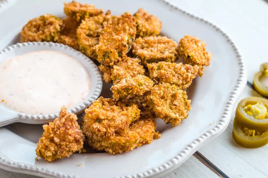Air fryer fried jalapeno chips have a crispy outer breading and a tamed jalapeno slice inside. They make an excellent finger food at parties or to snack on while you are watching the big game – like the Super Bowl!