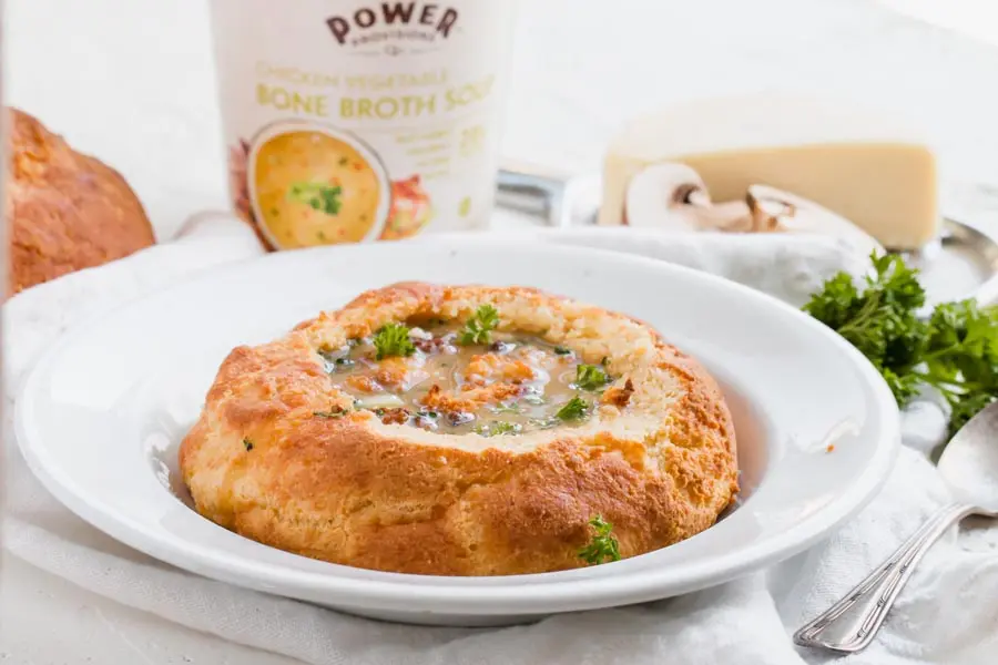 A bowl of soup in a keto bread bowl is a simple recipe to serve at lunch or dinner. The low-carb bread bowls will take around 20 minutes to prepare. If you use a ready to make keto soup, like those from my friends at Power Provisions, you can have a bread bowl filled with hot, comforting soup in less than 30 minutes!