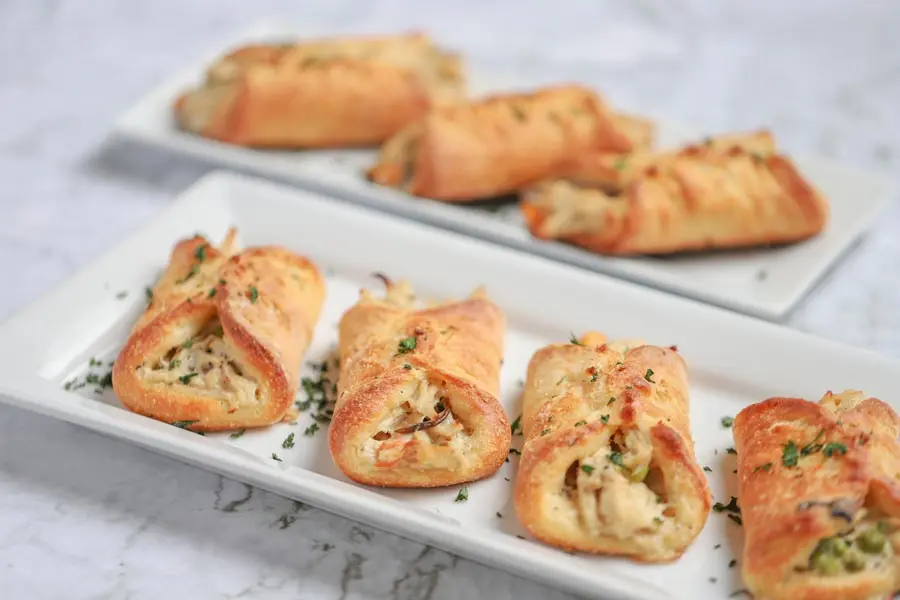 Scoop a spoonful of chicken pie filling onto each rectangle and fold over. Repeat with remaining dough.