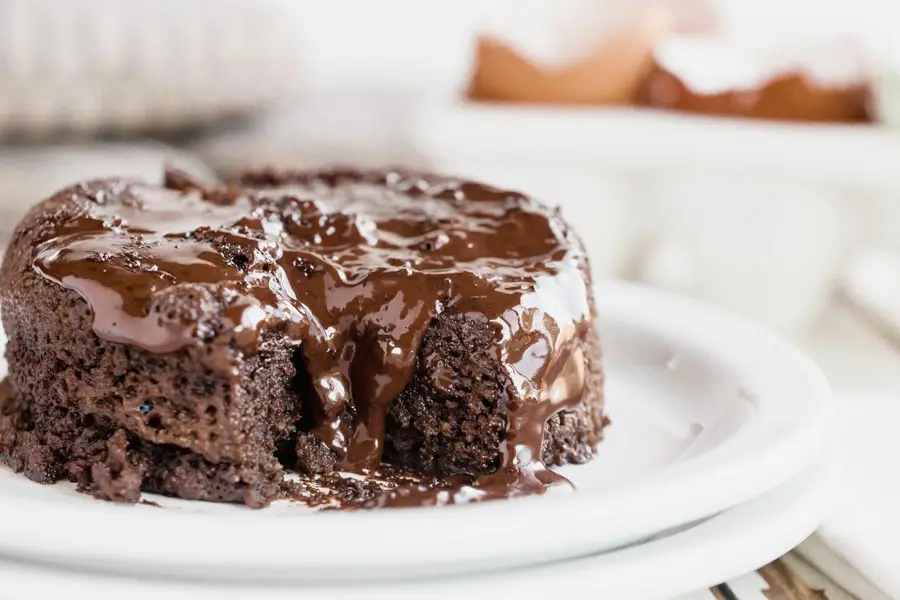 Top with broken pieces of chocolate. Drizzle water on top. Microwave on high for 2 minutes or until edges of the cake are set. The center will be tacky and moist to the touch.