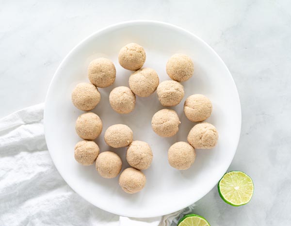 Using your hands, knead the coconut lime dough until the mixture is combined. Refrigerate for 15 minutes before rolling into balls.