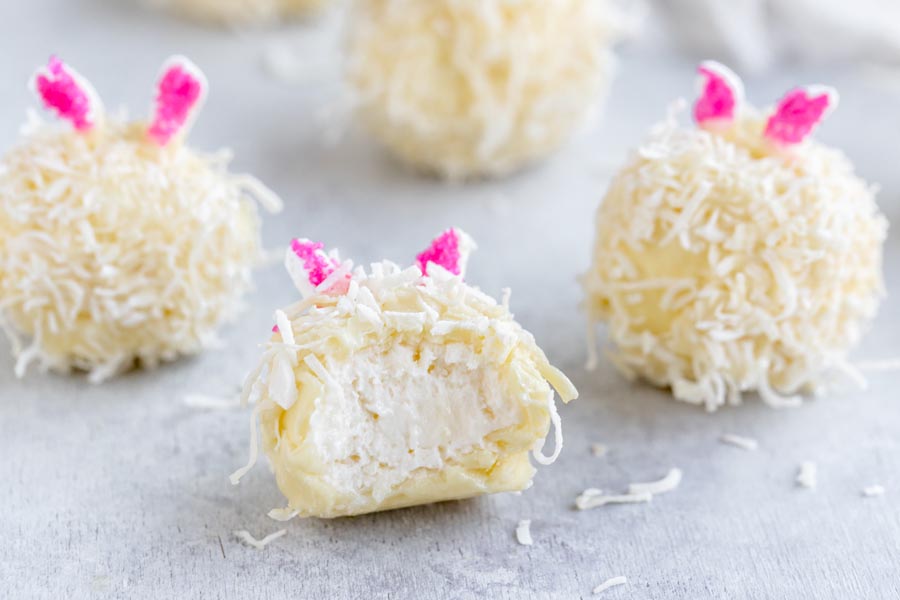 Cut out bunny ears from sugar-free marshmallows and glue on each cheesecake ball with melted white chocolate. Store in the refrigerator when not enjoying.