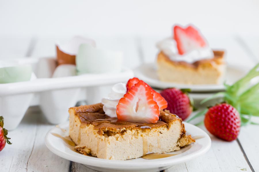 Pour the egg mixture into a the baking dish and bake at 350 degrees for 40 minutes or until golden brown and set on top. Remove and let cool. Serve with berries, sugar-free syrup or whipped cream.