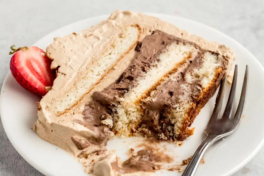 With both homemade layers and store-bought layers, this cake is simple but still impressive. The keto cake and ice cream are store-bought while the mocha whipped topping is made fresh. Although you could make your own keto chocolate ice cream if you really want to go all out!