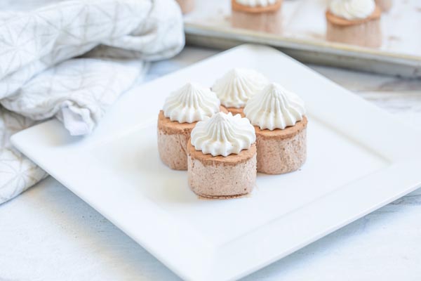 To make the whipped cream, add heavy cream to a medium bowl and whip until stiff peaks form. Add sweetener and vanilla. Continue whipping until incorporated. Add whipped cream to a piping bag or you can dollop the whipped topping onto each fat bomb using a spoon.