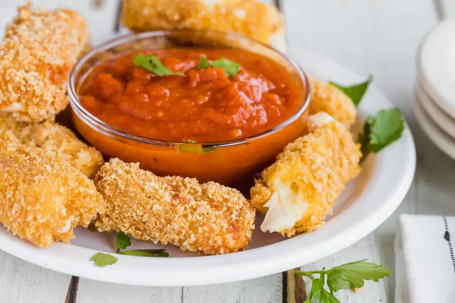 - No parmesan cheese, coconut flour or homemade breadcrumbs – Many of the most popular mozzarella cheese stick recipes call for a combination of grated parmesan cheese, coconut flour or require you to make your own breadcrumbs. The problem with using grated parmesan is that it changes the cheese flavor of your fried mozzarella stick. Instead of a mild, creamy cheese, you will be tasting notes of nuts and salt. The problem with using coconut flour is that coconut flour has such a strong underlying coconut odor which will give your cheesy appetizer a hint of coconut flavor. And there is no need to add extra time making your own breadcrumbs.