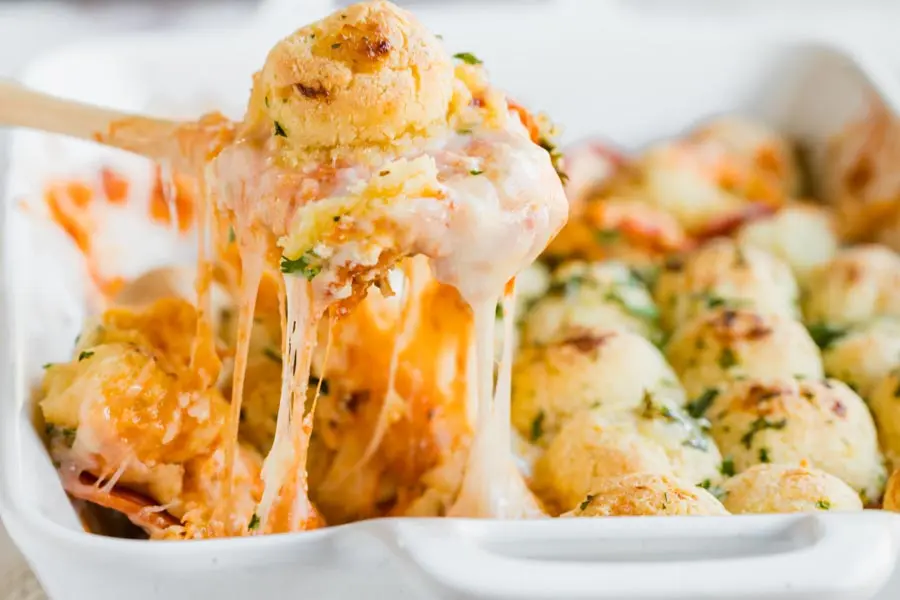 This keto pizza casserole skips cauliflower and ground beef entirely. Layers of cream cheese, marinara, pepperoni, and buttery pull-apart almond flour rolls on top that my kids actually request on Friday nights.