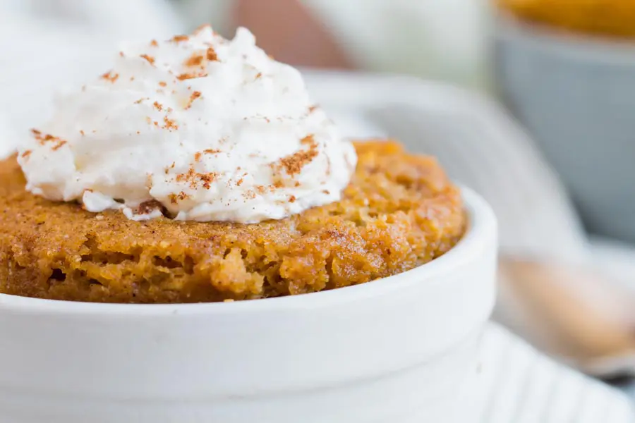 This morning I found this recipe and decided to try it. I opened a can of pumpkin for another recipe the day before, only used 1/4 cup of so I wanted to use the leftovers. As I made this recipe, I mixed the ingredients in a bowl and then poured it in a big coffee mug as my ramekins that I have are too small. It took 2 minutes to fully cook this mug cake in microwave. I let it sit for a few minutes and then turned it upside down onto a plate. It was perfectly cooked. I cut it in half and it was a perfect serving size. So bonus that one recipe will make us two servings. I loved how it is very moist and so tasty!!!! I added whipped cream and I really enjoyed this dessert. Thank you I will be making this again for sure!