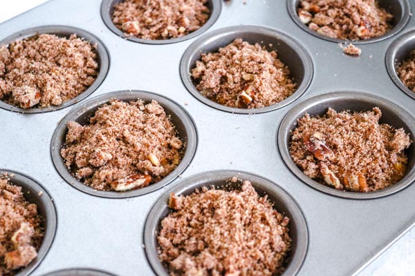 To make the pecan streusel, add all the ingredients to a small bowl and cut in butter using a fork or pastry blender until coarse crumbles form.