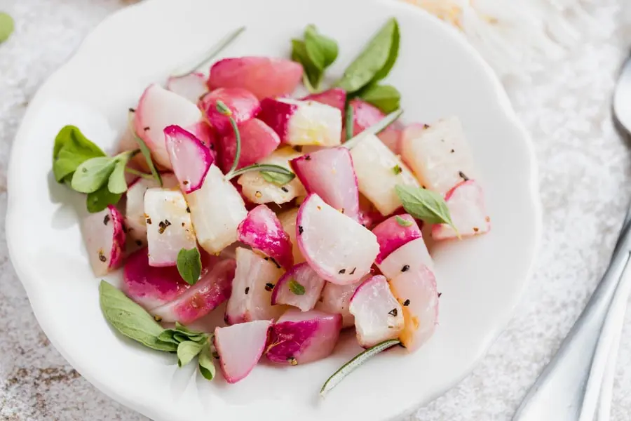 The perfect side dish to any low-carb meal are keto roasted potatoes! We baked purple radishes in the oven because look like red potatoes and taste similar to potatoes when baked. Hence, why they are often called the keto “potato!”
