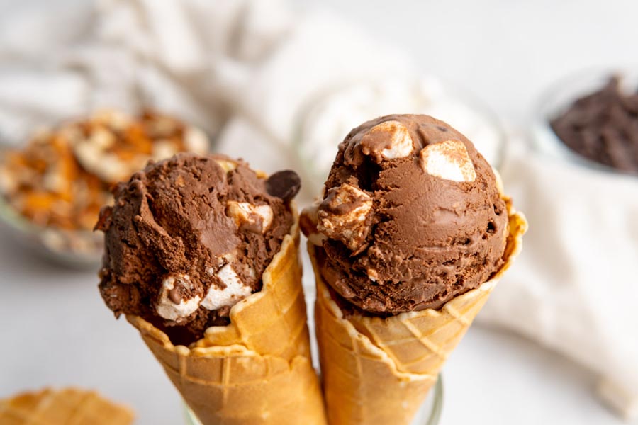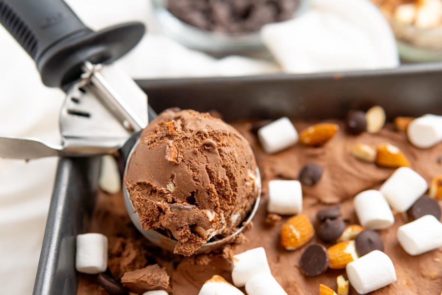 For a decadent, rich chocolate flavor without the sugar, this keto rocky road ice cream feature has a creamy texture balanced perfectly with crunchy chopped almonds and squishy sugar-free marshmallows.