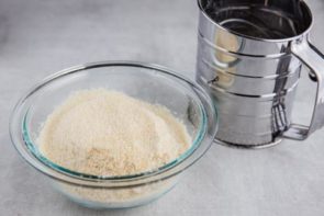 In a small bowl, sift together flours, baking powder, and salt. Set aside.
