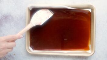 - Stir in vanilla, and pour it into a baking dish that’s been lined with parchment paper, spreading it out until even.