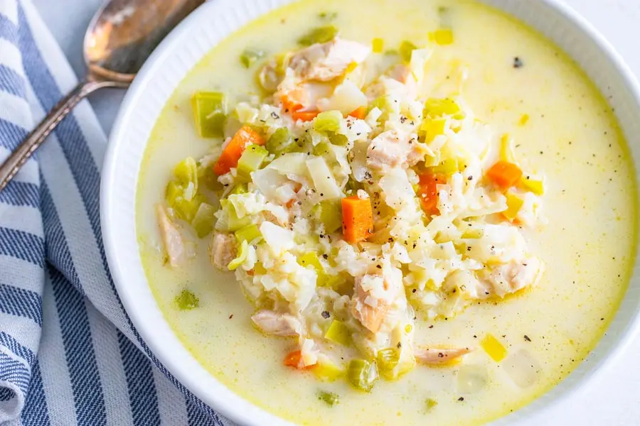 One of the best ways to use leftover turkey and make use of that leftover turkey carcass is to make a keto turkey soup with cauliflower rice. This keto soup recipe is creamy and filled with healthy fall vegetables. In place of potato in this low carb soup, we add daikon radish. It looks and tastes very similar to a potato.