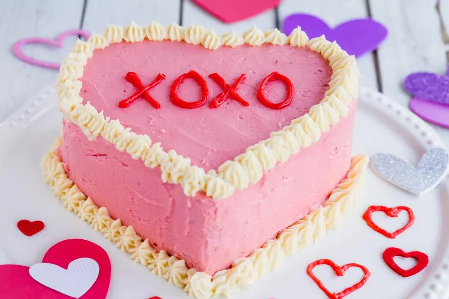 To cut your cake into a heart shape, cut the bottom edges of the cake on both sides to form the bottom V shape of the heart. Move those cut piece to the top to form the M shape of the heart. Use frosting to glue these edges on.