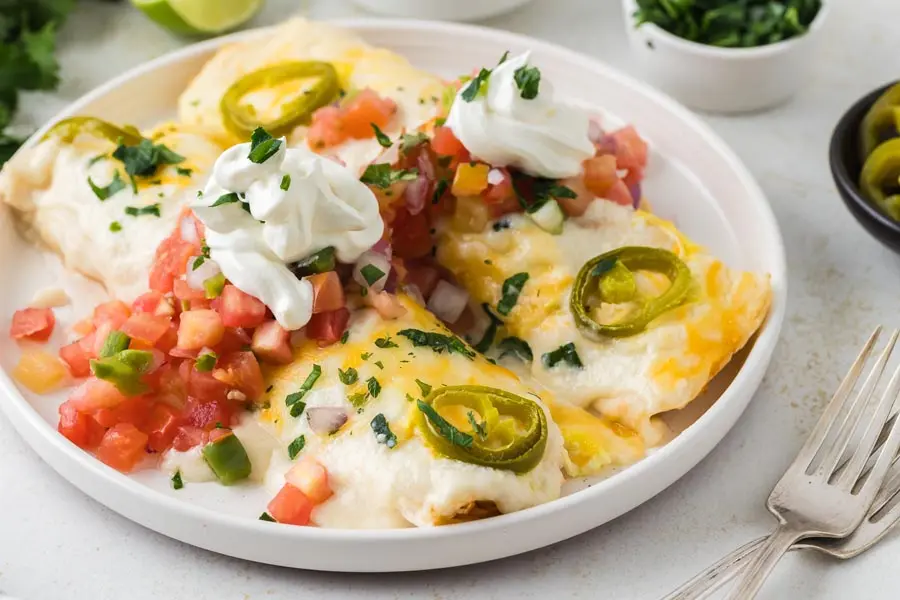 Pour white sauce over enchiladas.Top with remaining 1 cup shredded cheese and evenly scatter jalapenos all over. Bake at 375 °F for 20-25 minutes or until cheese is melted.