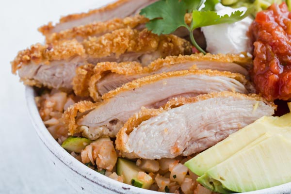 Enjoy as an easy keto lunch or dinner. Low carb chicken fajita rice bowl is a recipe you can meal prep ahead of time. Chicken and roasted red pepper are topped over a bed of Spanish cauliflower rice. Top with sour cream and salsa for the ultimate Mexican fare.