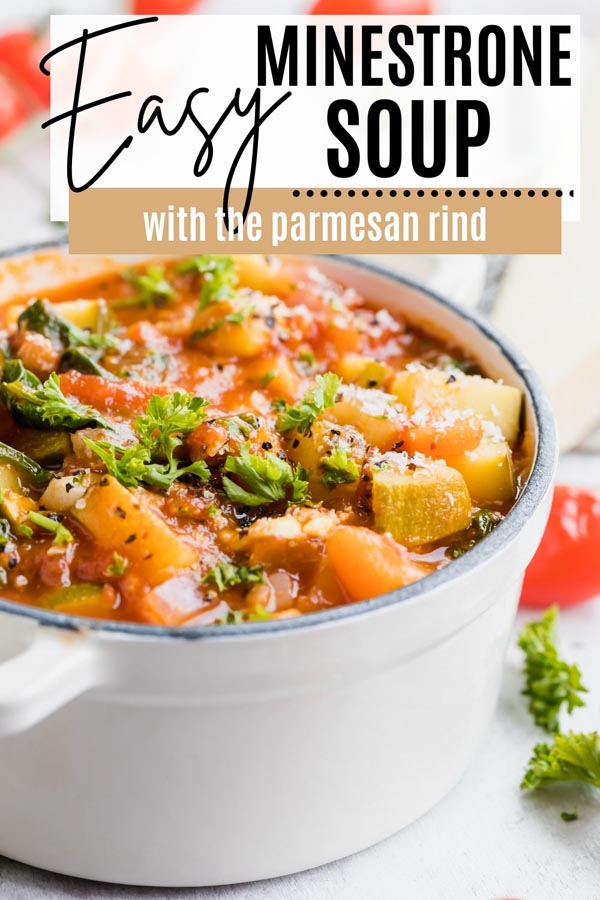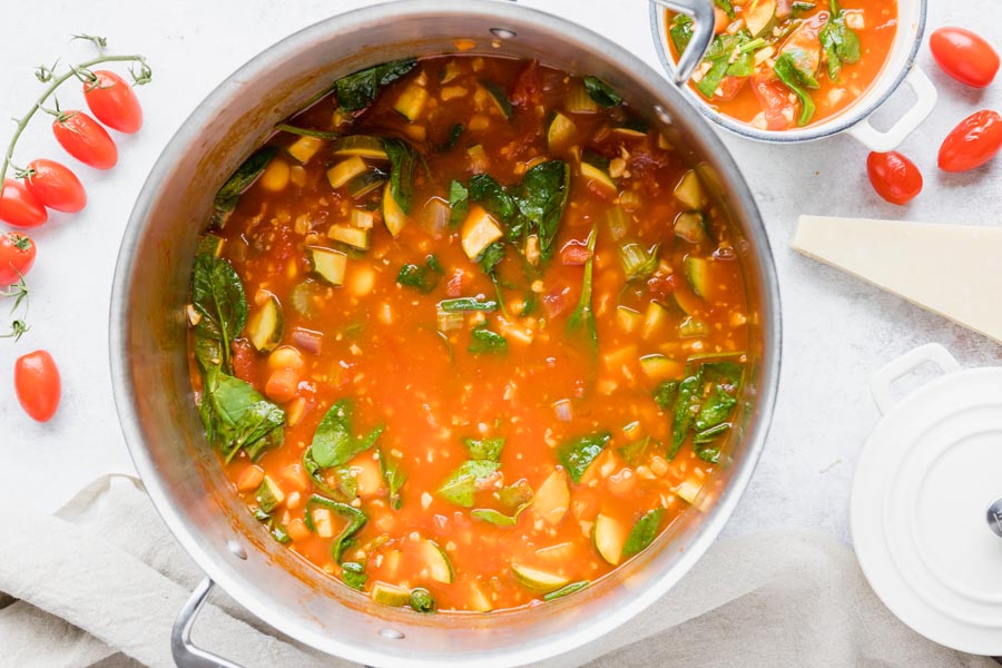 Add chicken broth or vegetable broth, 1 teaspoon salt, zucchini, tomatoes and parmesan rind. Bring to boil, then reduce heat to a simmer. Let cook uncovered until vegetables are tender (at least 20 minutes). The longer you let the soup simmer, the more flavor the parmesan rind will release.