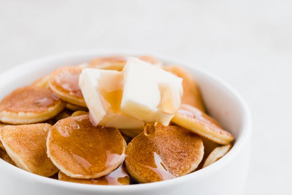 Add mini keto pancakes to a small bowl and top with heavy cream or nut milk. Or add a few slices of butter and pour in sugar free pancake syrup.