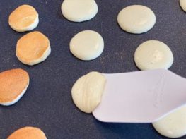 Once you have finished piping out mini pancakes on the entire surface, return to the first keto pancake and flip it. I found using a small rubber spatula works best to flip the pancakes. Cook them longer for a crispier pancake cereal.