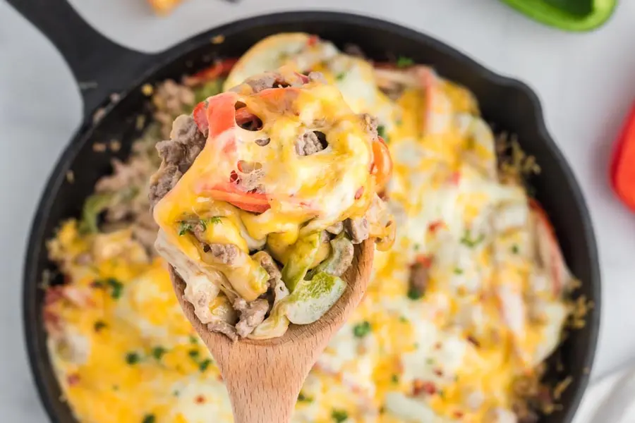 You’ll still get the beefy flavors with sautéed peppers and onions, along with melted gooey cheese, but you can skip the bun and just make everything in one pot. Not only will you save money and time using ground beef instead of shaved ribeye, but with three different kinds of cheese, you’ll savor every delicious creamy bite!