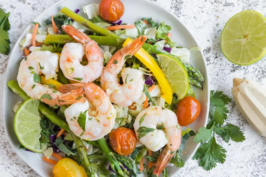 Cilantro lime shrimp baked with roasted vegetables and bursting cherry tomatoes. I serve this over cauliflower rice or on a salad: the bright citrus marinade makes every bite pop.