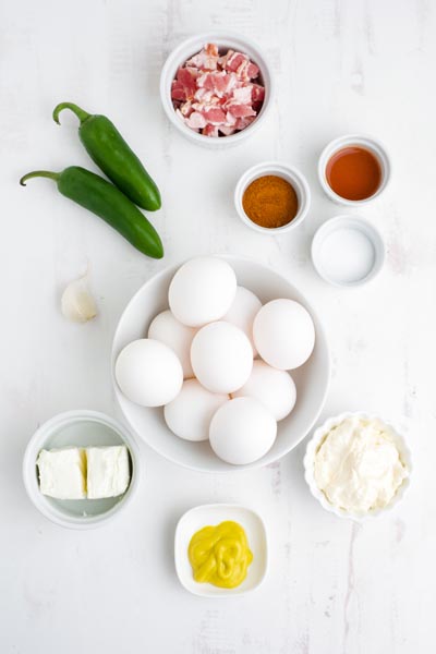 The creamy filling has a kick to it with finely chopped jalapeno peppers, hot sauce and a dash of cayenne pepper. While crispy bacon, garlic, cream cheese and mustard help to balance out the heat of these jalapeno deviled eggs.