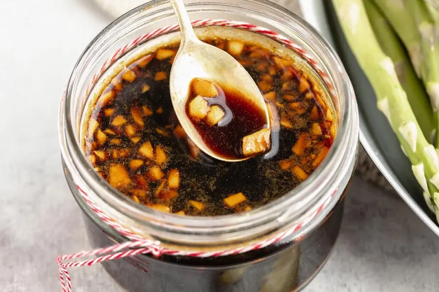 Add soy sauce, vinegar and minced garlic to a small bowl or mason jar.